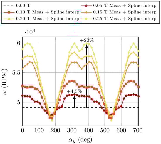 The motor angular speed was measured using the transversal motor holder configuration. Figure 20 reports the measured absolute value of the angular speed as a function of the motor axis orientation, for field intensities ranging from 0 to 0.25 T. The black dotted line in Figure 20 indicates the nominal speed of RPM, corresponding to the rated voltage and zero magnetic field. Experimental data are shown as markers, while the continuous lines represent spline interpolations. The results demonstrate a clear dependence of the rotational speed on both the orientation of the motor axis and the magnetic field intensity. An increase of approximately 4.5% was observed at 0.05 T (corresponding to RPM), reaching up to about 22% at 0.25 T ( RPM).
