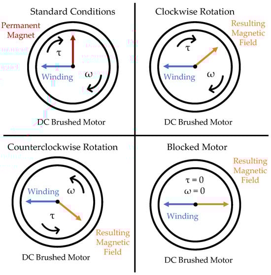 Little effort has been devoted by the research community and industry to studying the behaviour of DC motors operating within strong magnetic fields, which represents the overall goal of the present work. The first study found in the literature dates back to 2010, when Yun et al. [27] investigated the behaviour of brushed permanent magnet DC motors used in multileaf collimator (MLC) systems for real-time image-guided radiotherapy. In their experiments, motor speed and current were measured under external magnetic fields up to 2000 G (0.2 T) generated by an Electronic Expansion Valve (EEV) electromagnet, with tests conducted for three different motor orientations to reproduce possible installation or rotation configurations. The results showed that in most cases the magnetic encoder failed before any damage occurred to the gearbox or the motor itself, thus defining an upper limit for safe operation. Since fringe magnetic fields in linear accelerator–magnetic resonance (linac–MR) systems are expected to exceed these tolerance levels, the authors concluded that magnetic shielding would be required. In other studies, Heggo et al. [28,29,30], analyzed the effects of high electrostatic and external magnetic fields on inspection UAVs for the monitoring of offshore high-voltage DC (HVDC) wind farms. In particular, the impact of an external magnetic field of 77 mT on the operation of a quadcopter’s propulsion Brushless DC (BLDC) motors was assessed, showing that the direct torque control (DTC) algorithm was unable to keep the system stable under such conditions.