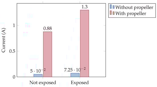 The final aspect analysed in the test campaign was the electrical current consumption of the motors. As shown in Figure 22, for a brand-new motor without magnetic field and without a propeller, the measured current absorption was approximately 0.05 A. When a propeller was mounted on the same motor, the current increased to A. In contrast, motors that had previously been exposed to a magnetic field of T showed a higher current demand under the same conditions. At 0 T, these motors absorbed A without a propeller and A with a propeller attached.