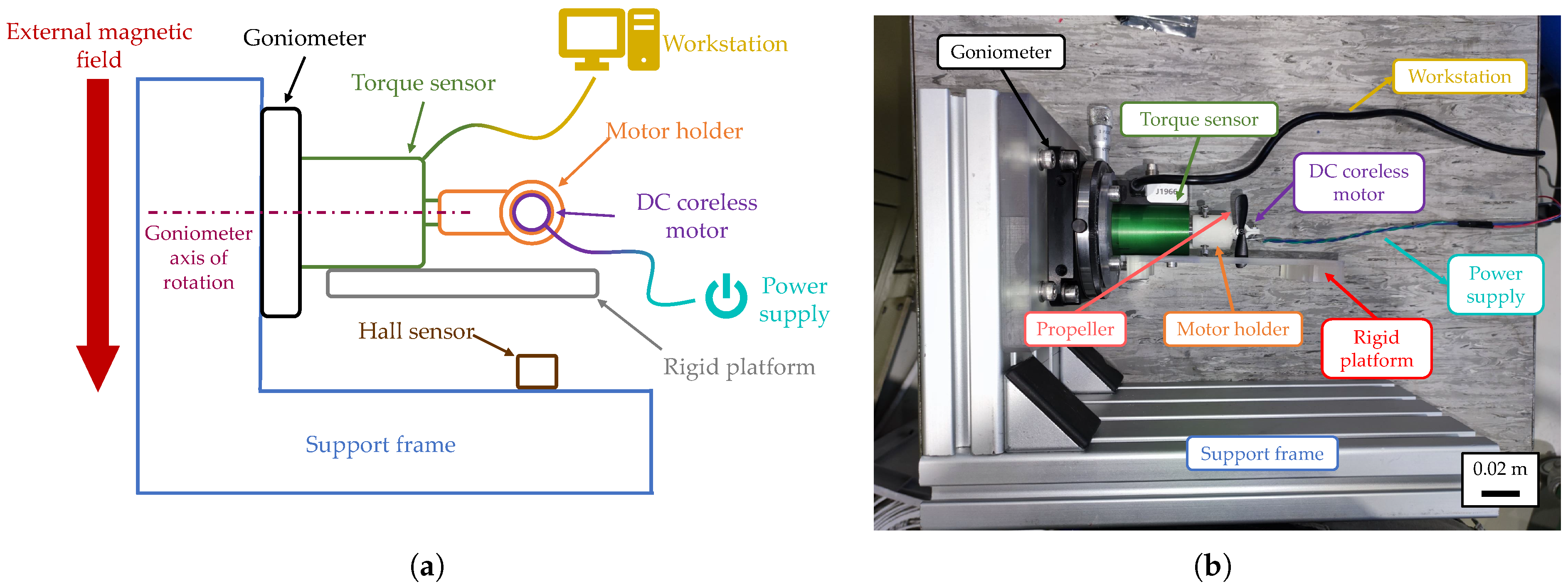 | Manual Goniometer | 2-inch Aperture Rotation Stage 7R172-2 (Standa, Vilnius, Lithuania), manual rotation, reading accuracy 1 arcmin, a-magnetic material | Controls motor orientation within the magnetic field. |