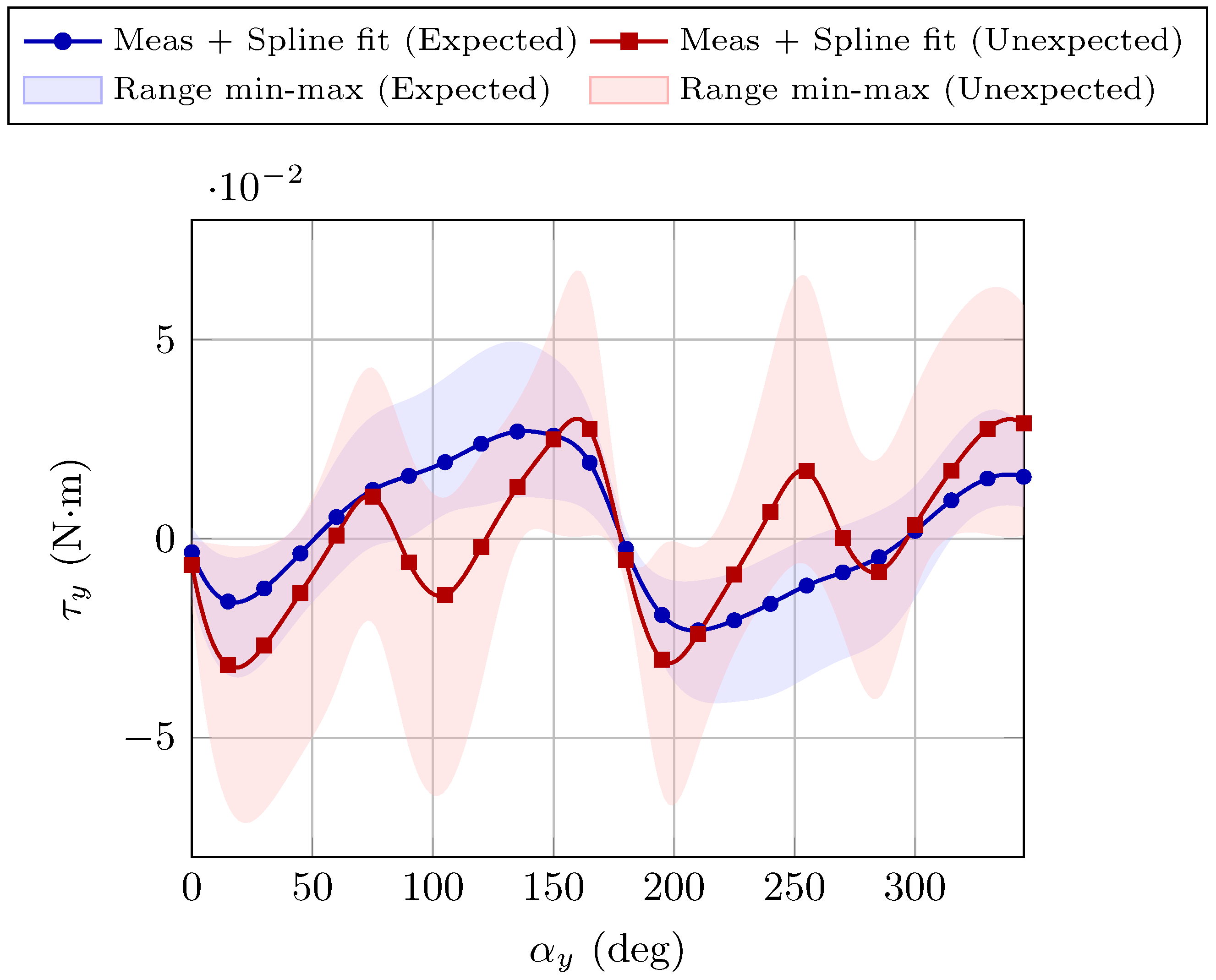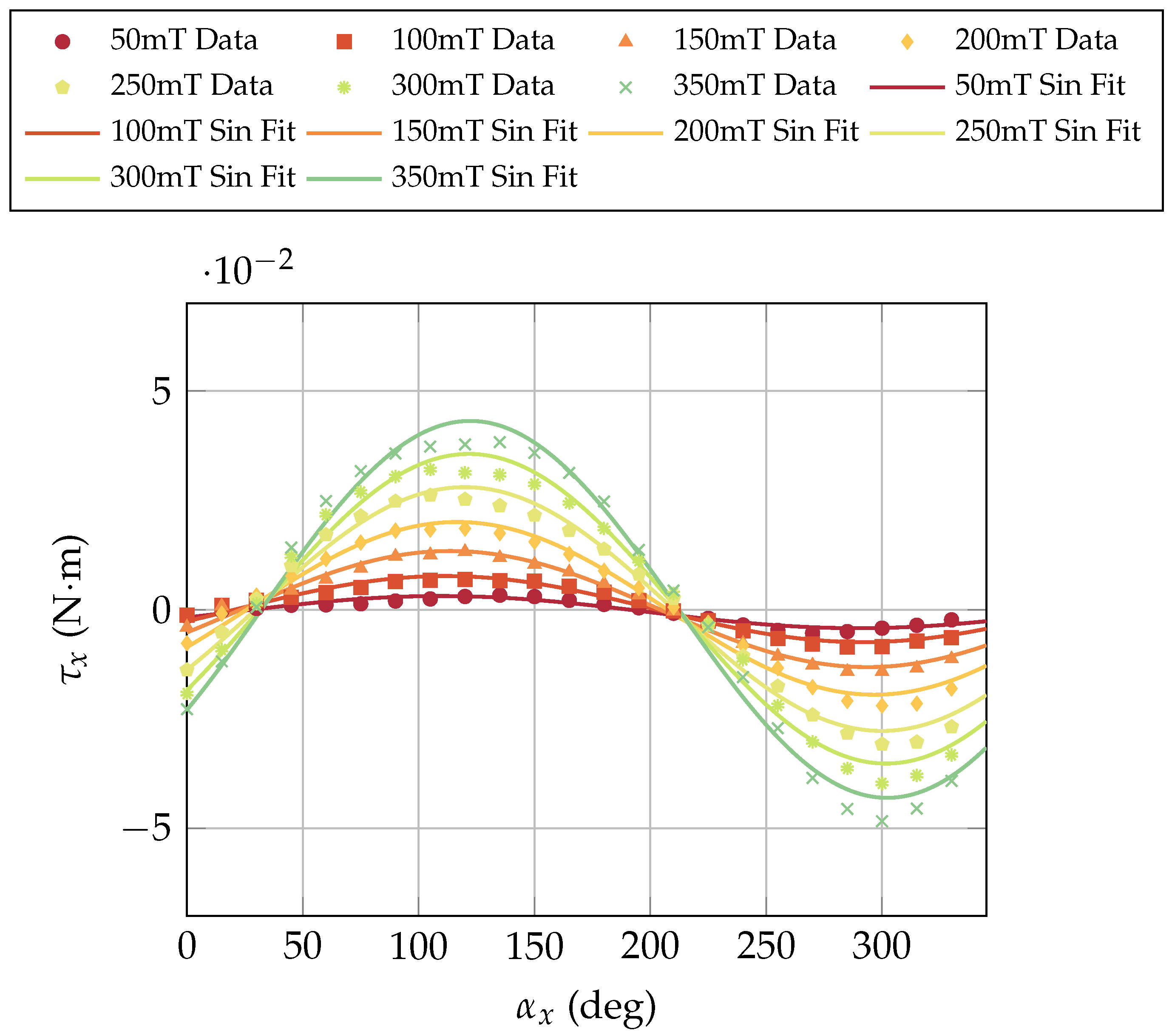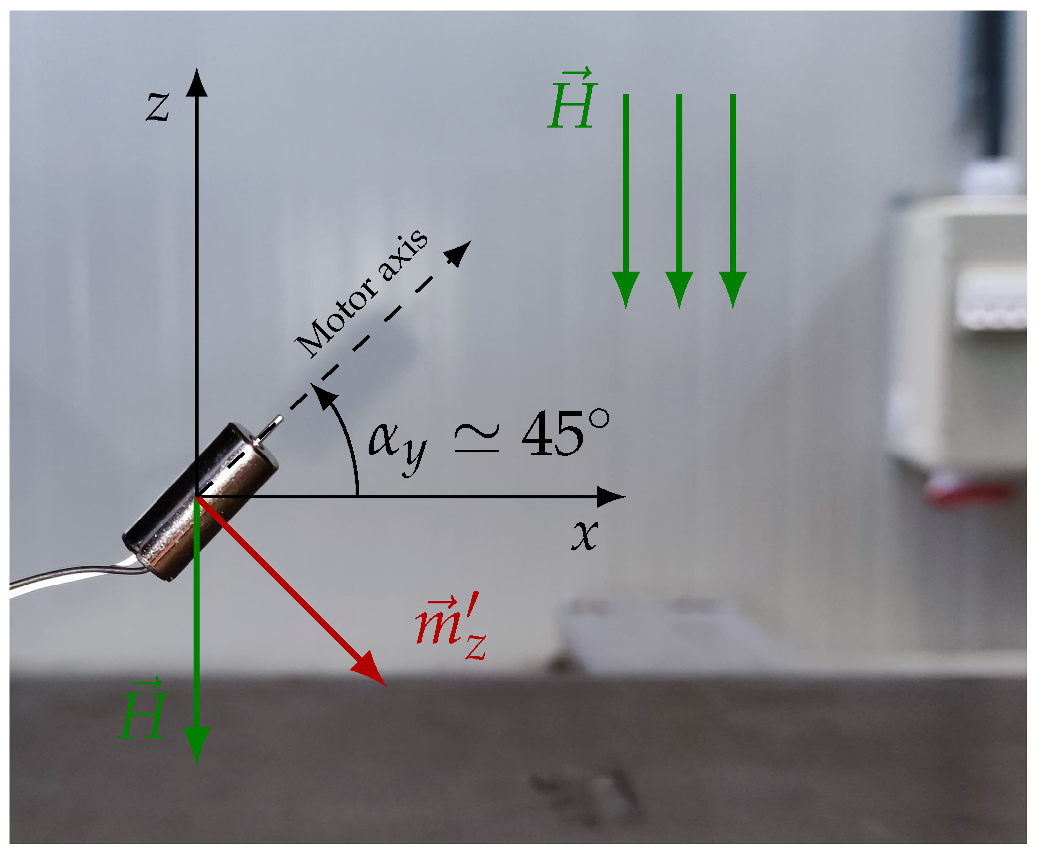 - Motor cover magnetization. The ferromagnetic motor cover can channel external magnetic field lines along its axis, resulting in two possible magnetization directions. Although this contribution should be limited by the cover’s saturation properties, it is not negligible and is likely the cause of the unstable equilibrium observed at in all torque measurements. At this orientation, small perturbations can force the field lines into opposite directions, generating divergent torque contributions with opposite signs and leading to instability.