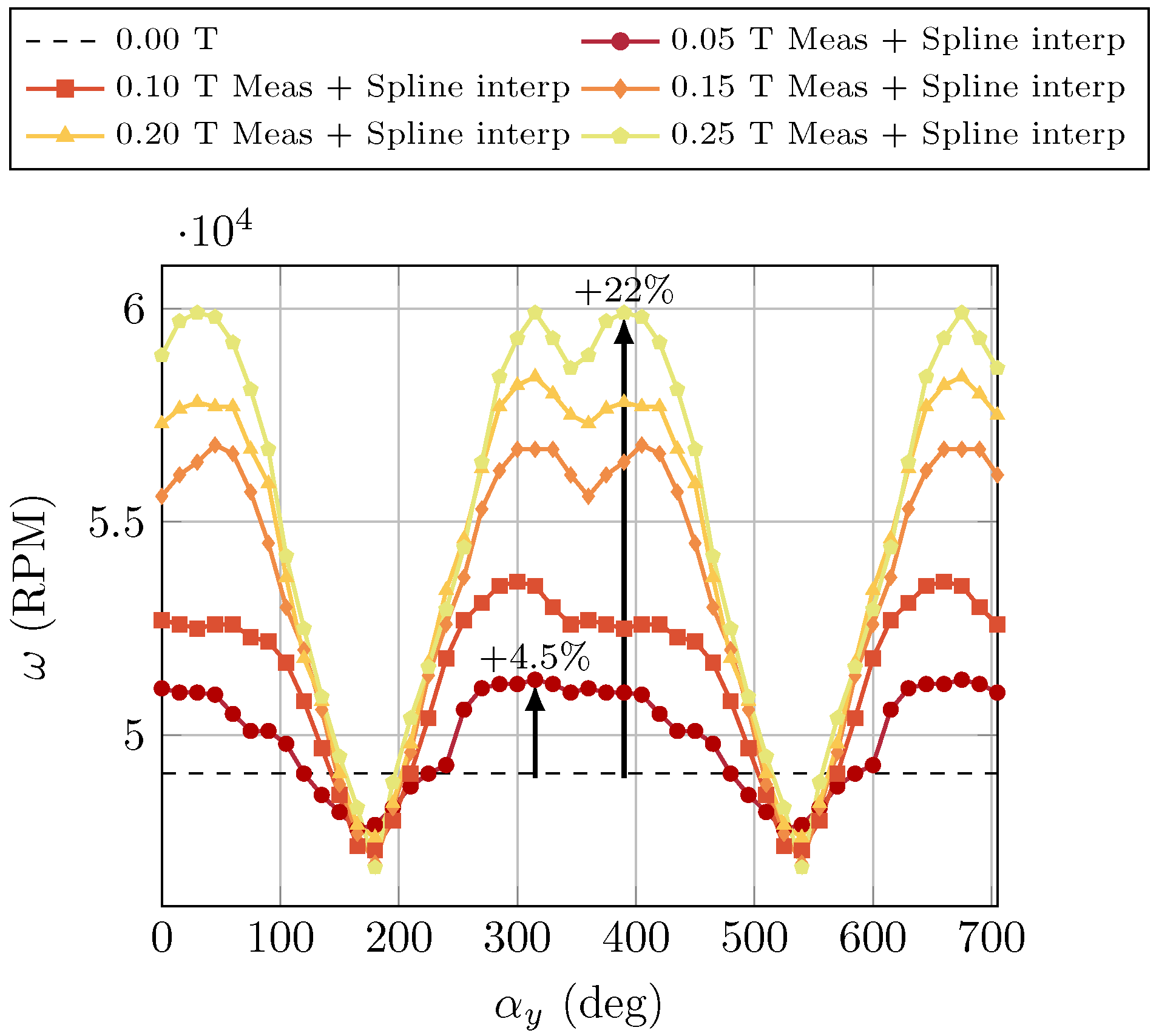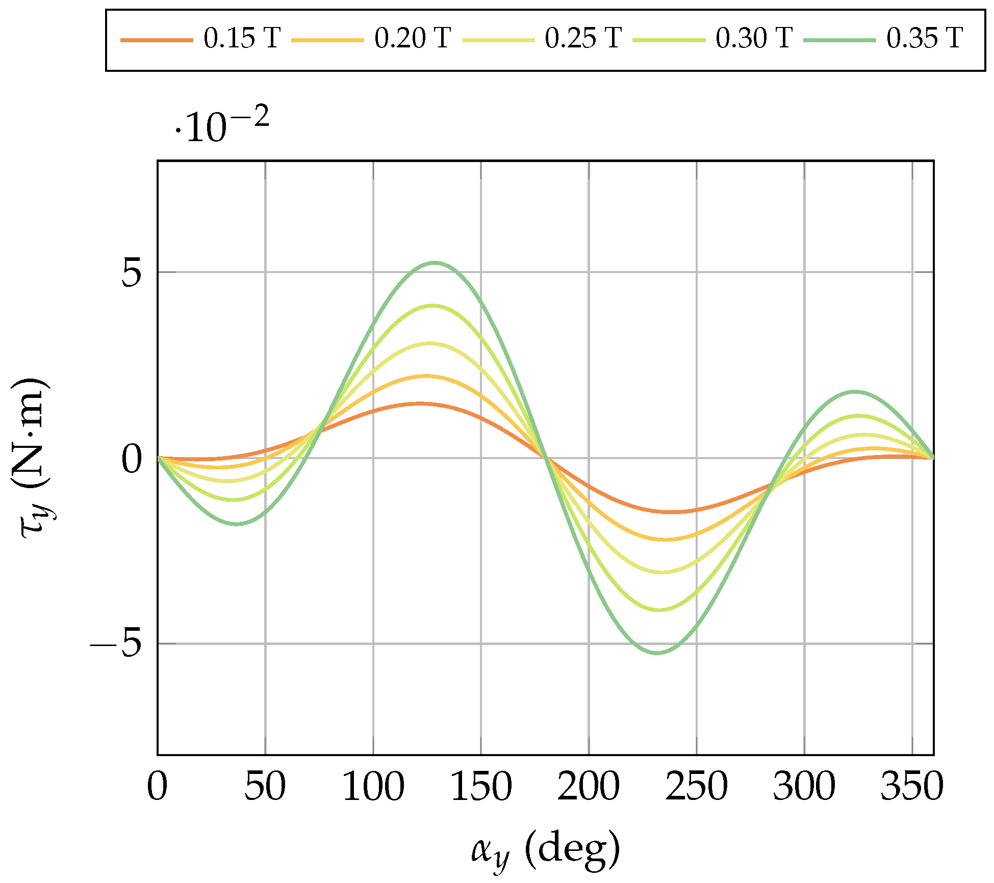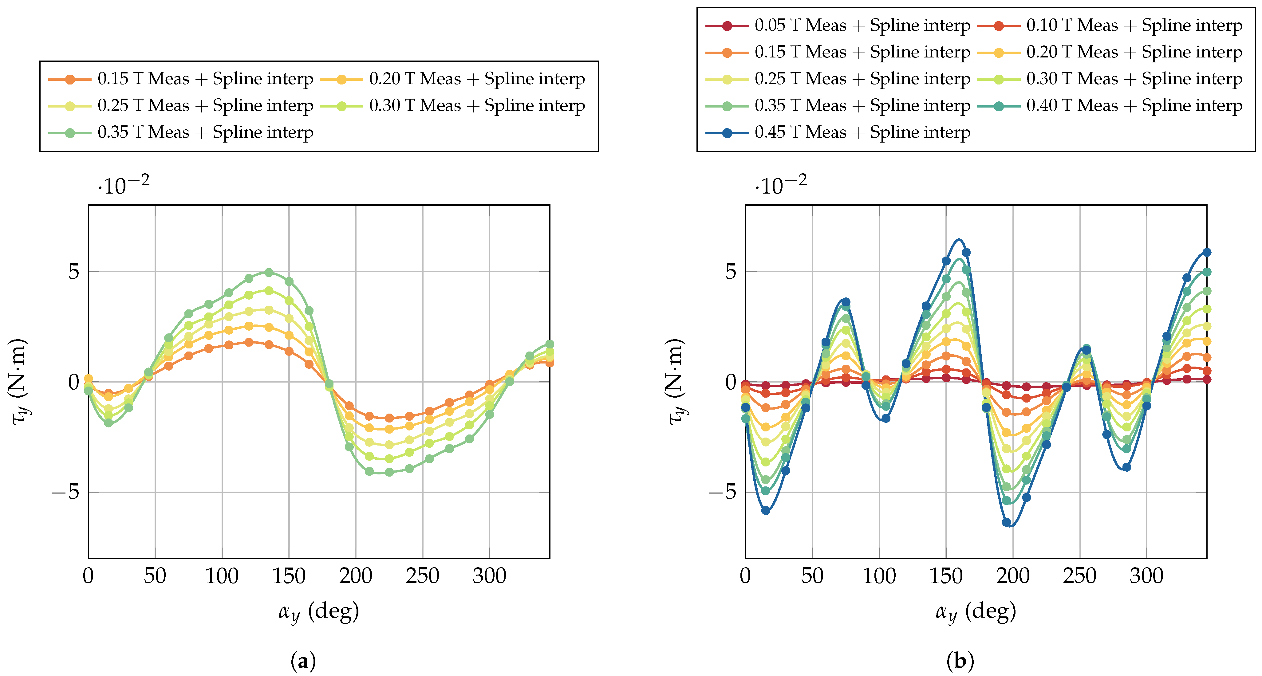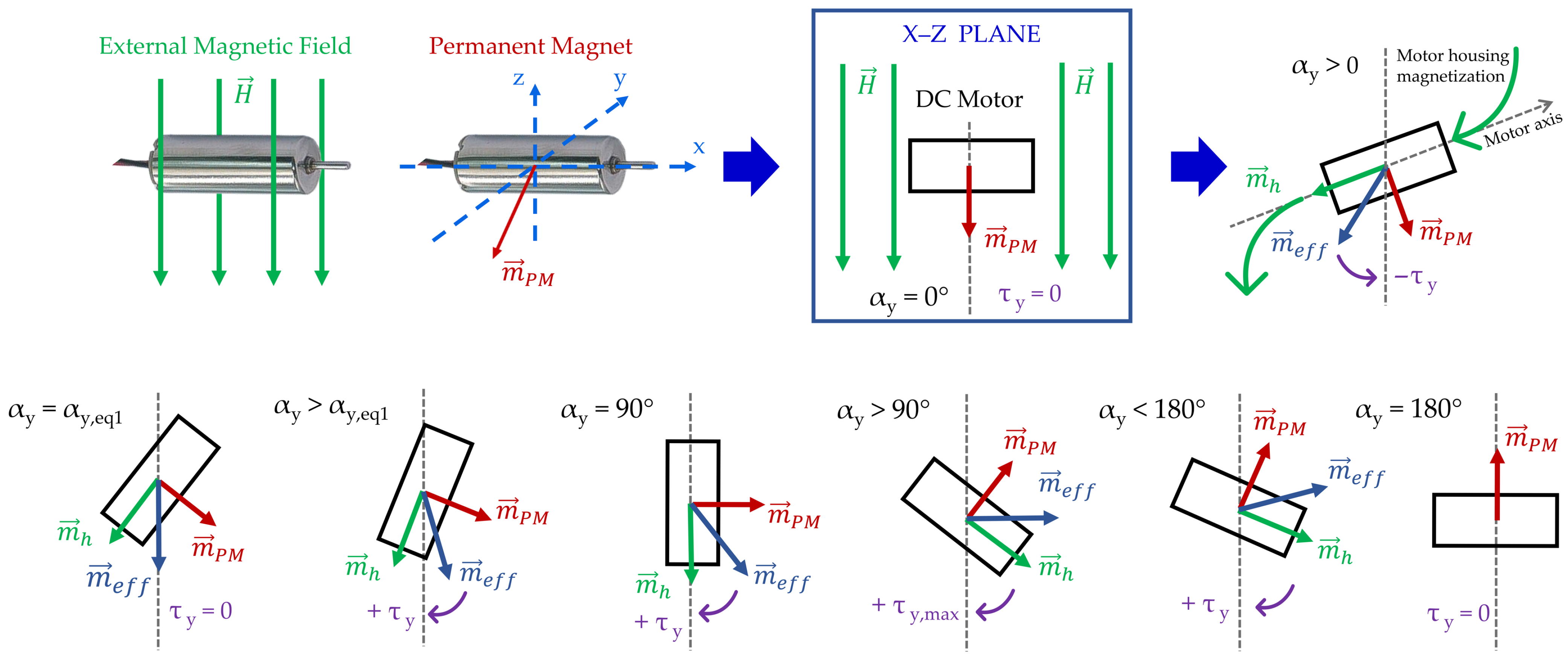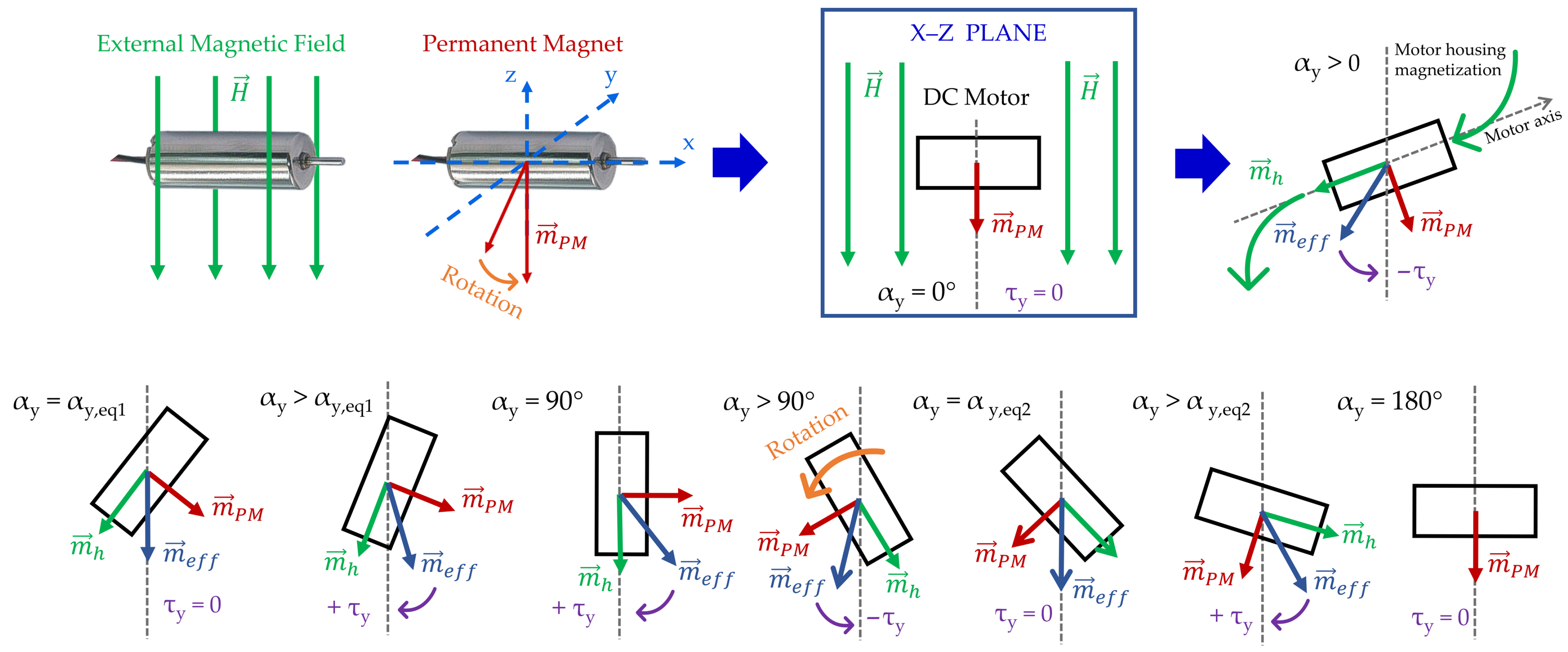 - Hysteretic material properties. High external magnetic field intensities may exceed the coercivity of the internal permanent magnet, altering its magnetization state in terms of saturation remanence and dipole direction. Consequently, both the magnitude and direction of the internal dipole can change, influencing the torque vector. This effect often occurs in combination with internal magnet mobility, further contributing to the modification of torque curves.