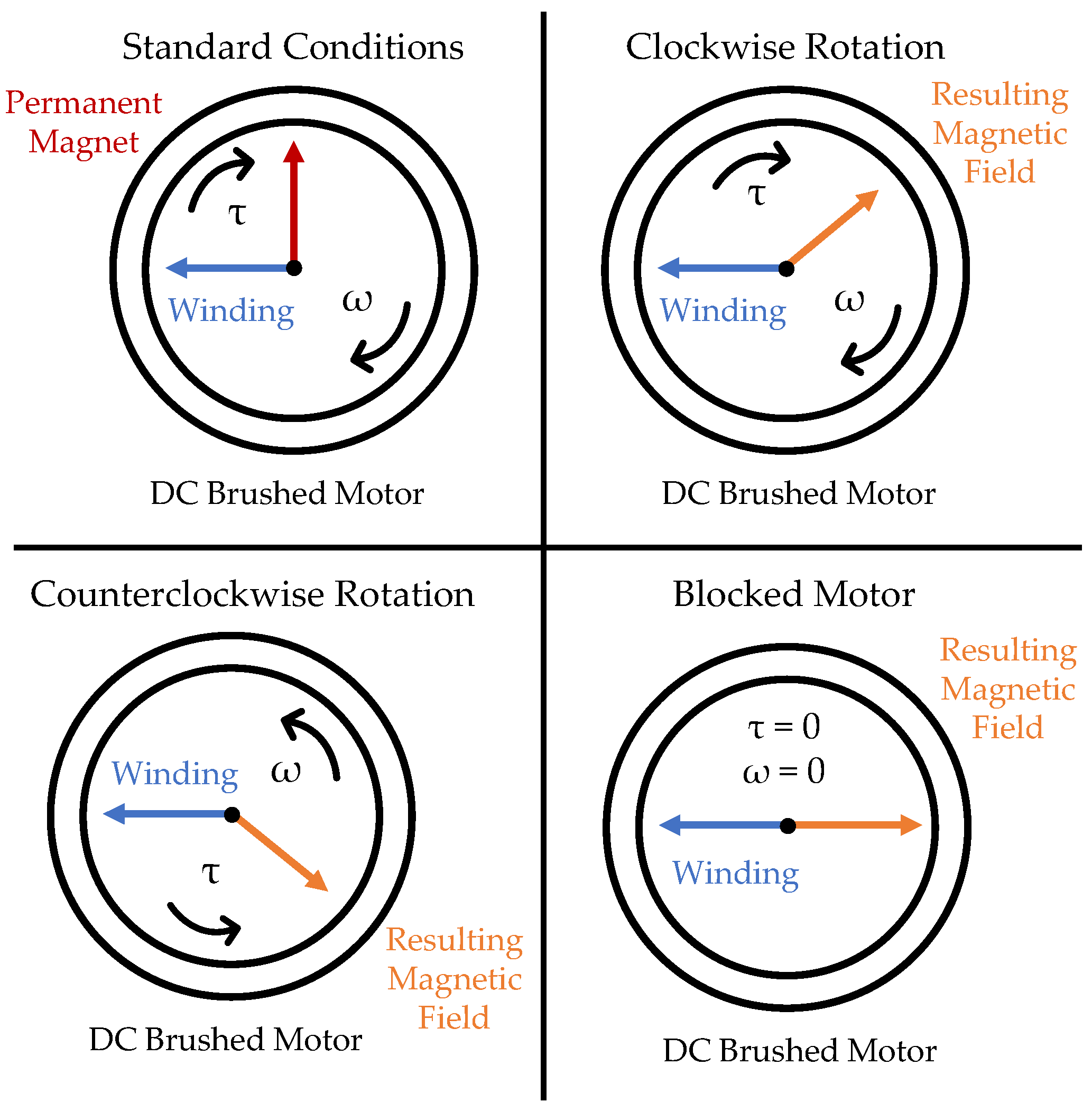 - Internal permanent magnet mobility. In some motors, the internal permanent magnet exhibited full or partial rotations during re-orientation within the external magnetic field, with different levels of friction. This behaviour is in contrast with the correct functioning of a brushed DC motor, where the internal permanent magnet (stator) should remain fixed relative to the brushes and housing. Motors with a movable internal permanent magnet tend to experience higher absolute torques compared to those with a blocked magnet, as the internal dipole tends to minimize the magnetic potential energy by aligning with the external field, thereby increasing the torque component along the y-axis.