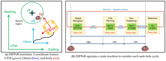The GPS system continuously outputs robot poses in the global UTM coordinates. The localisation module outputs robot poses in the local coordinate frame (“Odom”, origin at start of mission); this is estimated using the proprioceptive sensors. Robot poses from both coordinate frames are fed to the decision-making module—the mission manager. The perception module is another continuously running sub-system, reporting detected cones and hole positions to the manager whenever they are available. The mission manager maintains a state machine, which continuously compares DIPPeR’s position in all coordinate frames, against either the designated waypoint GPS positions or detected target positions. Two possible actions are issued by the manager: navigate to the target or dip the hole.