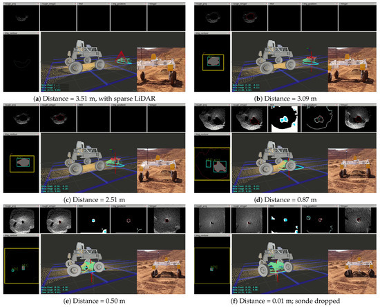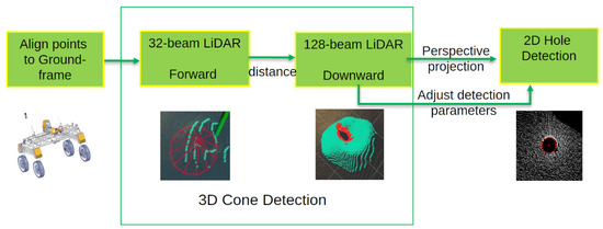 For successful hole inspection, DIPPeR must autonomously detect not only the holes but also the cones that obscure them, and track these features during approach to enable precise probe insertion. As shown in Figure 4, cones and holes are detected by processing point clouds from the two on-board LiDARs and projected images generated from these point clouds. When positioned to face a cone at a certain distance, the robot relies on its forward-facing wide FOV LiDAR to detect the cone, as it is the only large above-ground object within the prescribed search region. Initially, from a far distance, the cone occludes the hole when viewed from ground level. As the robot approaches the target, the high-resolution downward-looking LiDAR gradually reveals the hole’s position. Assuming both the cone and hole have symmetrical shapes, moving towards the object centre ensures continuous detection during subsequent servoing operations. This serves as the basis for successful 3D object tracking. To maintain accurate hole detection in the image domain, the tracking system continuously adjusts the projection and detection parameters based on the hole’s distance from the robot.