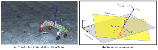 Robot base tilt correction. Correcting robot tilt is equivalent to rotating the base plane about vector by angle to re-align the vehicle’s x–y axis with their projections on the ground. Note for (a), ©Rio Tinto 2025, All Rights Reserved. Three-dimensional surface model generated using DroneDeploy, Inc. software. Visualised using Gazebo [11.0/Open-Robotics].