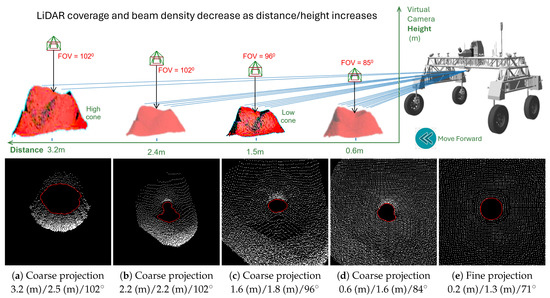 Due to beam divergence, LiDAR coverage on the cone face can vary significantly at different distances. To further complicate the situation, the holes are not perfectly cylindrical but have a funnel-shaped opening which narrows down to a cylinder about 30 cm below the ground and extends to a depth of several metres. These factors can cause significant variations in hole imprint in 2D images. To solve this problem, we apply a three-way proximity-based camera setting adjustment, which adaptively configures the virtual camera height, FOV, and image processing filters to match the changing data resolution. We define a look-up table (Figure 7) to model the variation in optimal camera settings as a function of cone distance.
