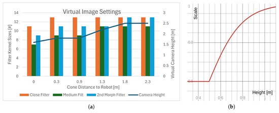 A cone’s distance and height has an effect on the virtual camera settings and the size of the smoothing filter. (a) Camera heights/filter size increase as the cone distance increases. (b) Plot of scaling Equation (5) that maps the cone height’s to the camera height.
