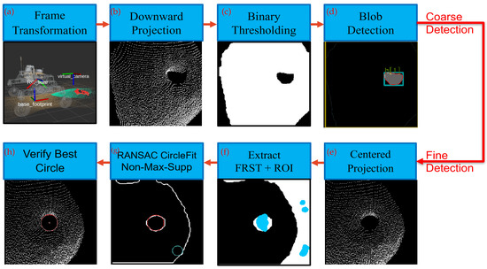 The absence of LiDAR returns provides the single most reliable feature for accurate hole detection and tracking. Based on this observation, we adopt an approach similar to [21] that relies on a LiDAR-to-2D and image-to-3D conversion process and perform hole detection in the image domain. Our domain conversion method directly follows the projective geometry principle in [22], and is easy to manage by selecting suitable projection parameters. Furthermore, we only use LiDAR for the inspection process; no camera sensor is needed to enhance sensor fusion or detection accuracy, due to the above-mentioned reasons. Specifically, we first project the 3D LiDAR points downward onto a virtual depth image and then perform hole detection in this image. Exploiting the fact that no LiDAR return beams come from the hole interior, our depth image is naturally segmented with an apparent void in the centre bounded by a cone collar (Figure 1f)—a prominent feature for visual servoing.