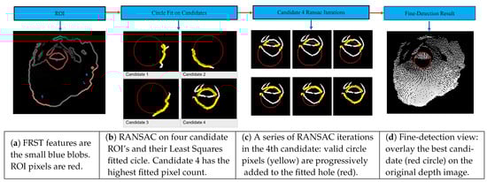 In this stage, standard contour methods are applied for hole detection. Since the cone and hole objects have fairly consistent sizes, simple thresholding can yield good detection results. Of all extracted contours, the largest one is usually the cone, shown in Figure 8d as a golden bounding box. If a void is found inside the detected cone, it is classified as the hole object if it is both of sufficient size and close to the image centre. A rough position of hole can thus be obtained after 2D–3D back-projection.