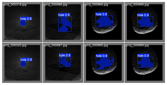 Despite not taking a learning-based approach in our work, we did explore the potential of training a detection network on the classifications generated by our classical detection pipeline. We auto-generated 916 pairs of images and marked hole regions—similar to the examples in Figure 6c–e—to train Yolo 11 [46] for hole segmentation. We used 711 pairs as the training set and 205 pairs for validation. The majority of the segmentation results match our expectation for coarse-stage projection. Yolo yields validation results of 0.98 F1 score at 0.58 detection confidence. A selection of validation results are shown in Figure 15.