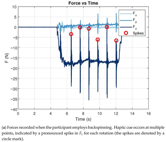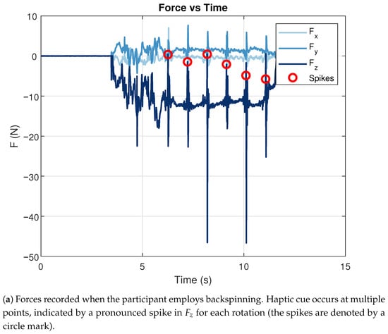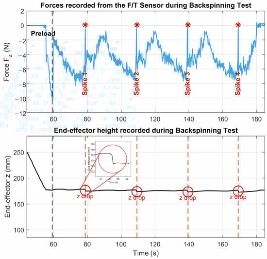 Note that the value of is derived from the human study results presented in Section 2, where it corresponds to the typical vertical pre-load during backspinning. Once this condition is satisfied, a flag is set, and the robot transitions to backspinning.