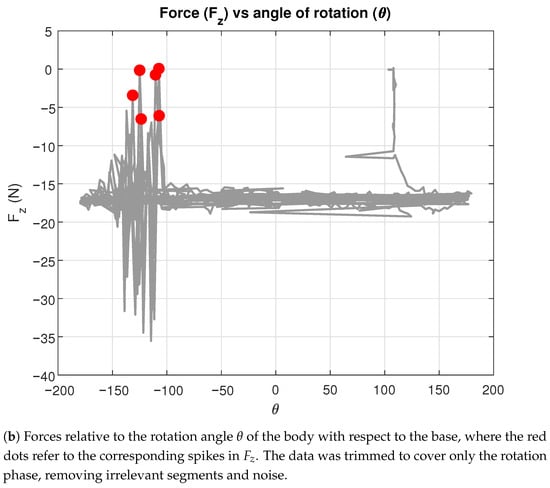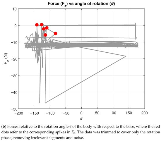 Figure 3b and Figure 4b represent the forces from the same trial expressed in terms of the rotation angle, , of the body relative to the base. However, there is a variation in the recorded location of the spike due to inaccuracies and non-ideal surface finish in the 3D-printed thread construction. Nevertheless, a clear and repeatable pattern of force spikes can be observed for each rotation, providing a reliable cue for identifying when engagement should be initiated. At this instance, the body and base are positioned such that the threads can begin to mesh smoothly, and the backspinning motion serves to reveal this cue without risk of cross-threading or jamming.