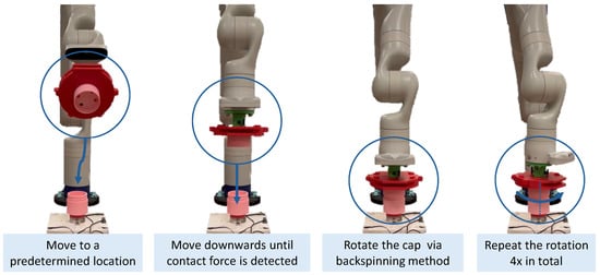 - Felip, J.; Morales, A. A solution for the cap unscrewing task with a dual arm sensor-based system. In Proceedings of the 2014 IEEE-RAS International Conference on Humanoid Robots, Madrid, Spain, 18–20 November 2014; IEEE: Piscataway, NJ, USA, 2014; pp. 823–828. [Google Scholar]
