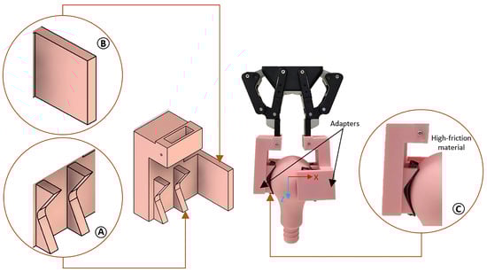 To ensure secure grasping of the bulb during manipulation, we developed an orientation-locking mechanical adapter. The adapter, illustrated in Figure 8, incorporates three key features that align the bulb with respect to the robot end-effector and constrain it relative to the gripper. Feature A consists of a contoured cavity that seats the bulb, restricting translations along the end-effector x, y, and z axes, while also constraining rotation about its y-axis. Feature B provides lateral support through side protrusions that specifically limit rotation about the end-effector x-axis. Feature C is the high-friction 3M Temflex cloth tape applied on the contact surfaces of Feature A to constrain rotation about the z-axis of the end-effector. Together, these features mechanically lock the bulb in both position and orientation. Importantly, the adapter is compatible with standard two-fingered parallel-jaw grippers.