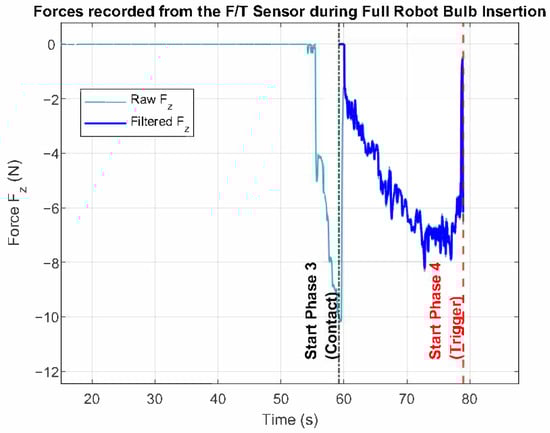 Figure 10 shows measured at the socket during the robot trial. After the bulb is grasped with the mechanical adapters, the robot retracts and moves towards the socket. Contact is registered once the pre-load condition in Equation (1) is satisfied, and a flag is raised to initiate Phase 3.