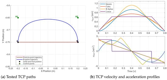 This section outlines the methodology adopted to compare the three manipulators in terms of energy consumption during a representative pick-and-place task. The selected operation serves as a reference because of its relevance and ease of replication in both industrial and laboratory contexts. The simulated scenario mirrors the typical workflow of the physical prototype RRR-D2, which is commonly employed to retrieve objects and deposit them onto a nearby platform (see Figure 3). In this study, four different trajectories are tested as described below. Figure 4 displays the tested TCP paths, along with the velocity and acceleration profiles.
