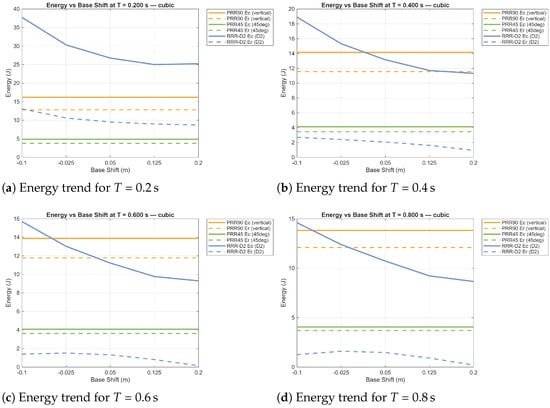 The energy trends for the cubic trajectory highlight clear differences among the three manipulators by varying the vertical displacement of the robot base. The RRR-D2 shows the highest energy consumption, with up to 35 for s and decreasing as the motion time increases. This behavior reflects the influence of gravitational and inertial loads on the rotary joints as also highlighted by the 3D energy plots. The downward trend with increasing suggests that certain configurations require lower joint torques due to more favorable postures. The recoverable energy remains much lower than the consumed one, indicating that most of the work compensates for gravity rather than being recoverable. Hence, compliant elements, e.g., optimal springs, could enhance the performance further.