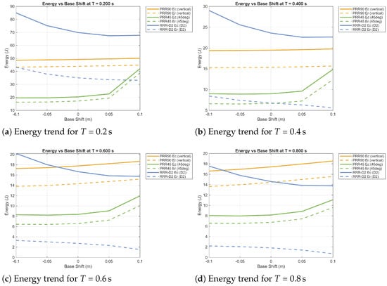 For PRR architectures, small local minima appear close to the neutral (around zero), mainly at intermediate simulation times ( 0.3–0.4 s). These correspond to configurations where the prismatic actuators share the effort more evenly, which reduces the global potential energy variation of the links and therefore the recoverable energy. For higher vertical offsets, one actuator usually works against gravity while the other works with it, increasing the amount of energy that can be exchanged between them. On the other hand, the RRR-D2 manipulator shows a more monotonic reduction in recoverable energy when T increases, mostly dominated by inertia and joint torque symmetry rather than gravity effects. To conclude, these maps highlight that both motion timing and structural configuration have a strong influence on defining the robot capability to regenerate energy, offering important insight for the optimization of the workspace and trajectory planning in energy-efficient manipulator design.
