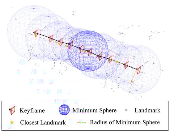 Concept of the minimum sphere: In maps generated by pose-graph-based SLAM systems, the sphere is defined as the smallest sphere that encapsulates the keyframe center, whose radius is determined by the closest distances to its neighboring landmarks.