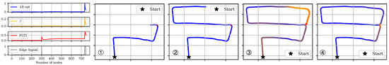 Visualization of normalized , , and in KITTI-05 case, together with several typical scenes during the tracking. ①: keyframe id 325, shortly after the first peak in edge-insertion signal; ②: keyframe id 600; ③: keyframe id 734, the starting keyframe of the second peak; ④: keyframe id 748, the last keyframe. Here, again, the horizontal axis corresponds to the keyframe index, and the curves show the evolution of each metric over graph growth, with the edge-insertion signal marking when new support-graph edges appear.