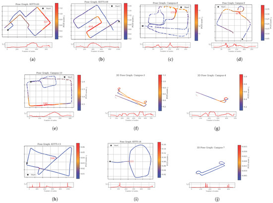 Visualization of real-world pose graphs with vertices colored by per-vertex PGTI scores . Brighter colors indicate larger values. Each subfigure (a–j) corresponds to one of the real-world examples listed in rows (a–j) of corresponding maps shown in Table 4. Trajectory self-intersections caused by scale drift (KITTI-00, KITTI-08); intersections from missed loop closures (Campus-8, Campus-9, Campus-10); perceptual aliasing in repetitive environments (Campus-3, Campus-4); and minor, essentially harmless inconsistencies (KITTI-13, KITTI-18, Campus-7).