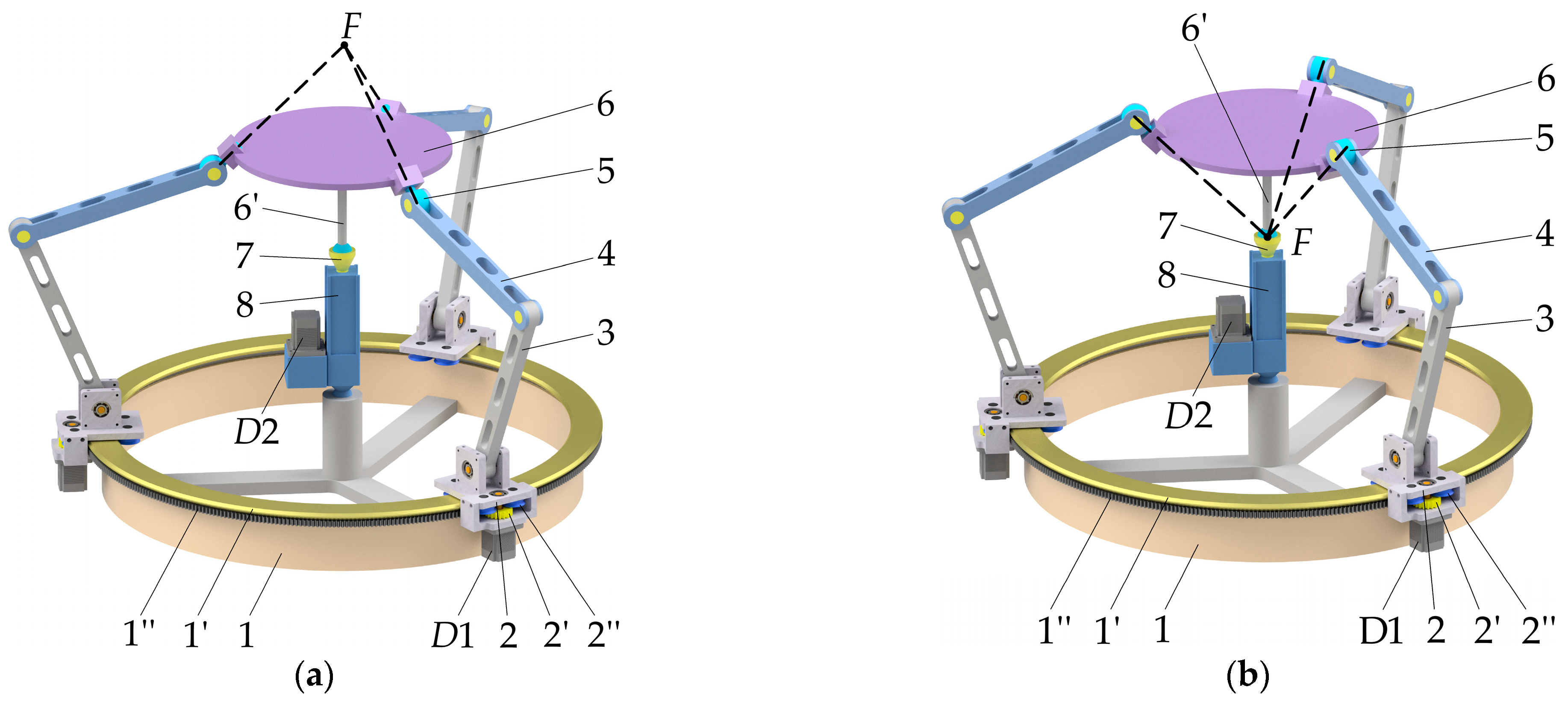 40]. The first variant requires simultaneous operation of all four drives to maintain a fixed pivot point, while the second achieves kinematic decoupling between the 3R and 1T motions. Another key design feature of these mechanisms is the circular rail, which provides the platform with an unlimited rotation around the rail axis.