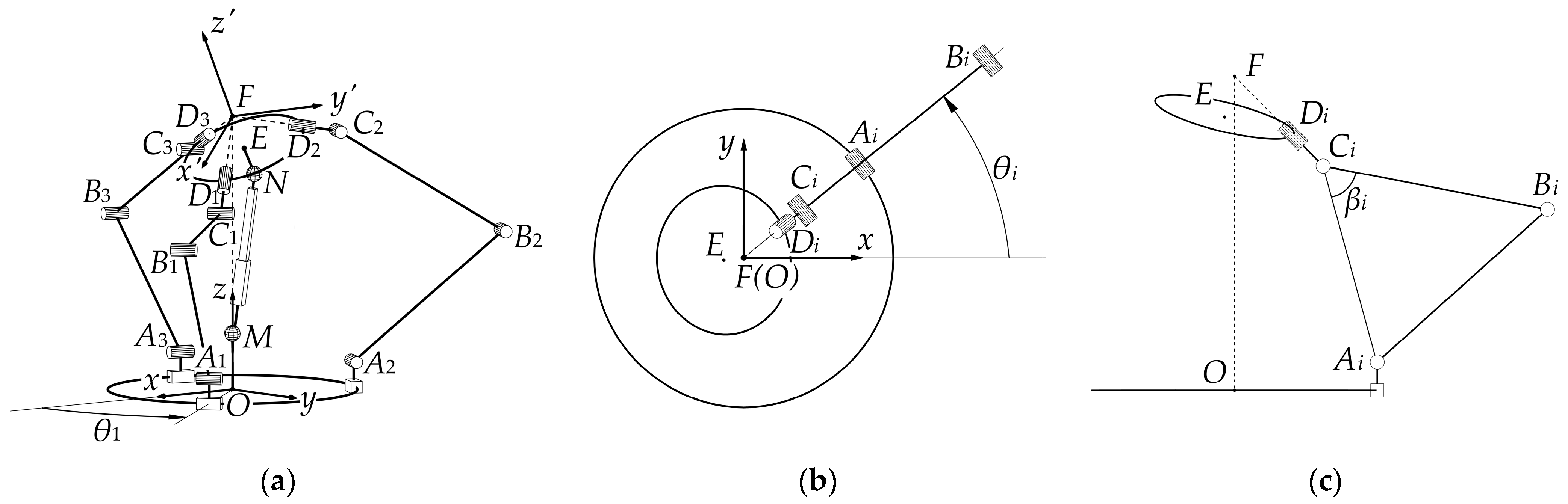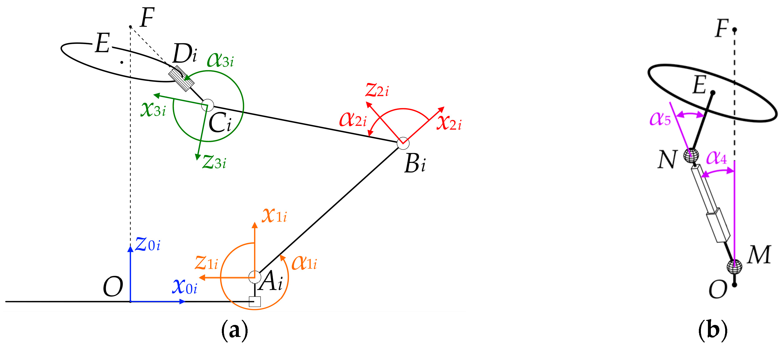 When a parallel mechanism is in a serial singularity, its moving platform loses one or more DOFs. In the case of the discussed mechanism, the platform linear motion is possible only along the axis, as any translation in the horizontal plane is constrained by wrenches of the side chains. Vertical motion is realized solely through the prismatic pair in the central chain. Therefore, the translational DOF is lost only if the central chain lies entirely in the horizontal plane, causing vector to have a zero component. This scenario is unlikely in the actual mechanism because of the joint constraints. On the other hand, the rotational DOFs can be constrained only by the side chains, since the spherical joints of the central chain permit this type of motion of the moving platform. By examining the twist system of the side chain, we conclude that the mechanism loses a rotational DOF if vectors , , and become linearly dependent in at least one chain —that is, if they are parallel to the same plane. In this case, all joint axes will be parallel to this plane. By design, is constant and is always orthogonal to both and . Therefore, the vectors lie in the same plane only if is collinear with . This means the mechanism is in a serial singularity if the axis of joint of any side chain aligns with the axis of the reference frame. The moving platform loses the ability to rotate around the axis defined by vector .