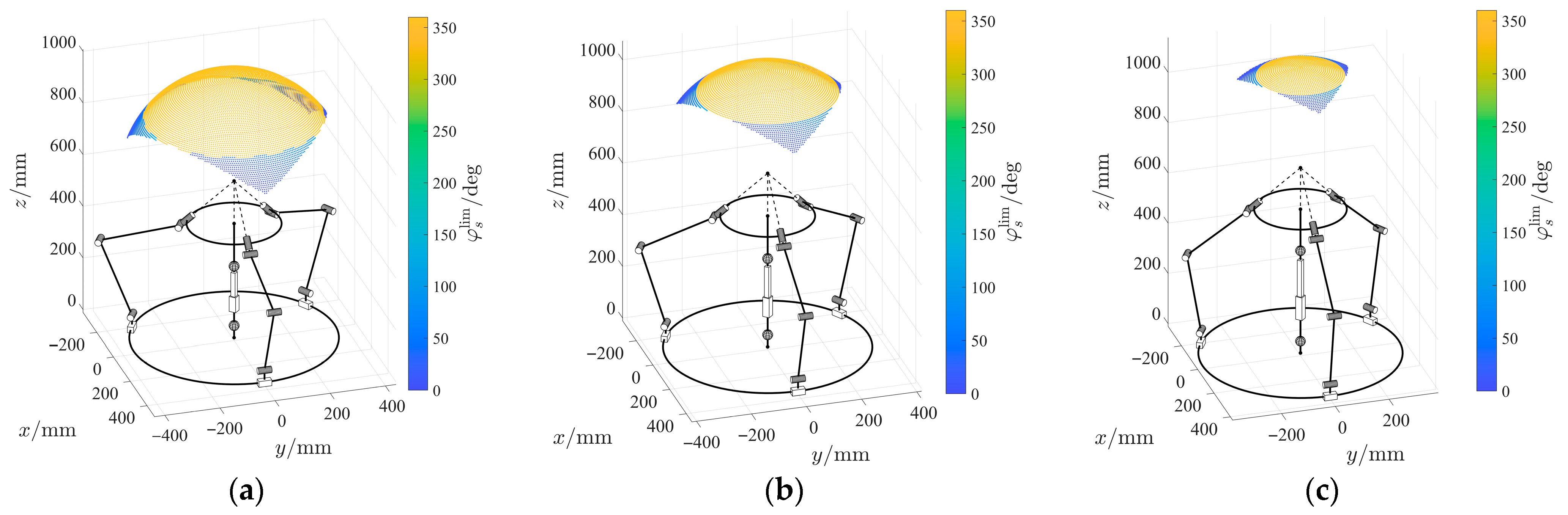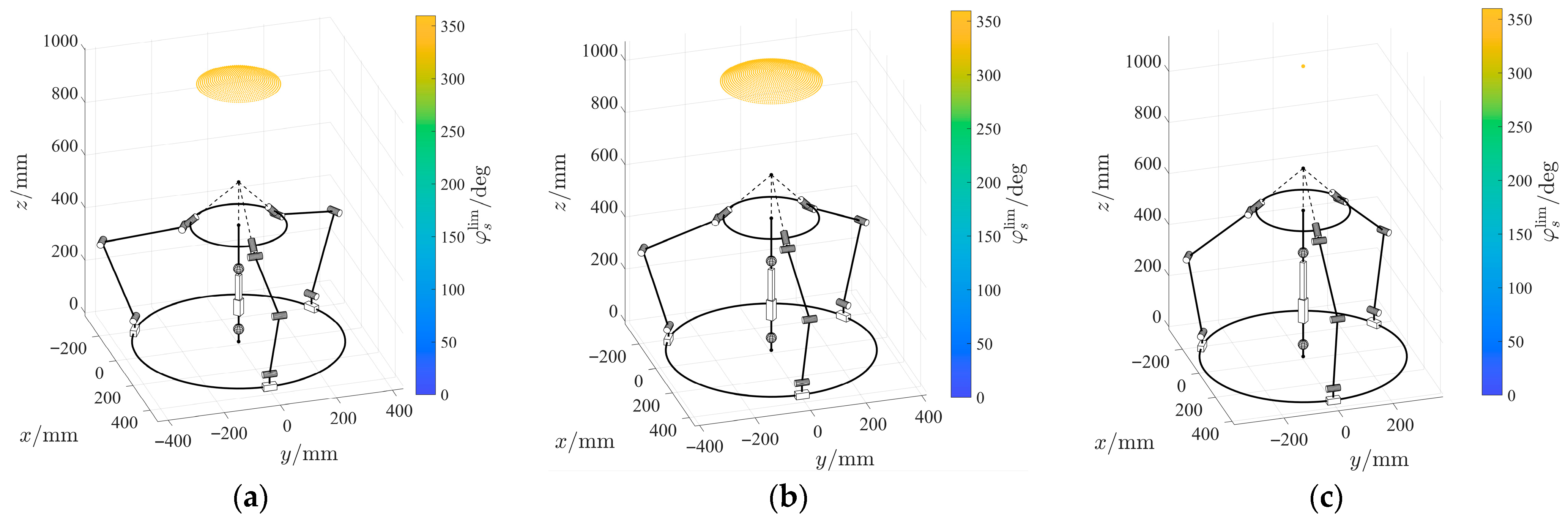 Figure 7b). This means that the mechanism has a singularity-free workspace where its moving platform can twist unlimitedly. Relaxing the joint constraints increases the maximum tilt angles but decreases the singularity-free region with full twists.