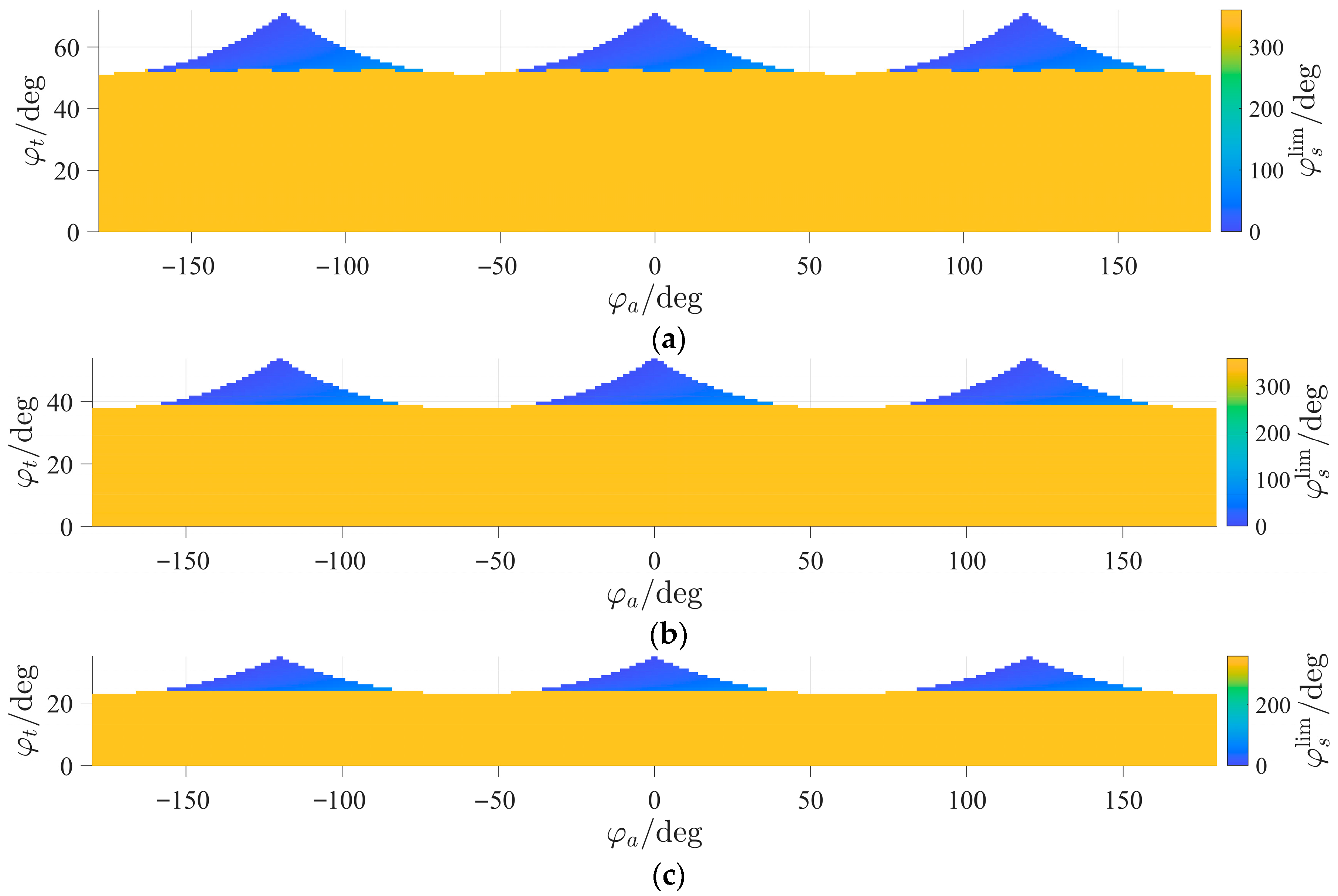Figure 5). The value of the maximum tilt angle depends on the height of the pivot point: the higher this point, the lower this value. At the same time, the region of singularity-free tilts with a full twist is limited to 33° (