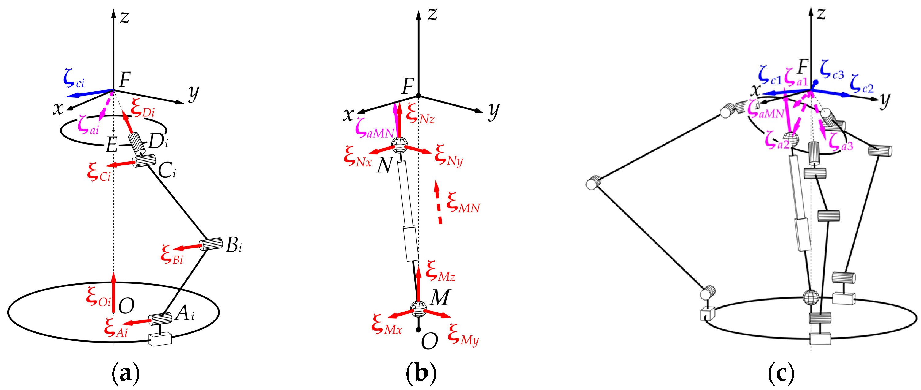 Figure 8b), there is one infinite-pitch twist corresponding to the active prismatic joint and six zero-pitch twists (three for each spherical joint):