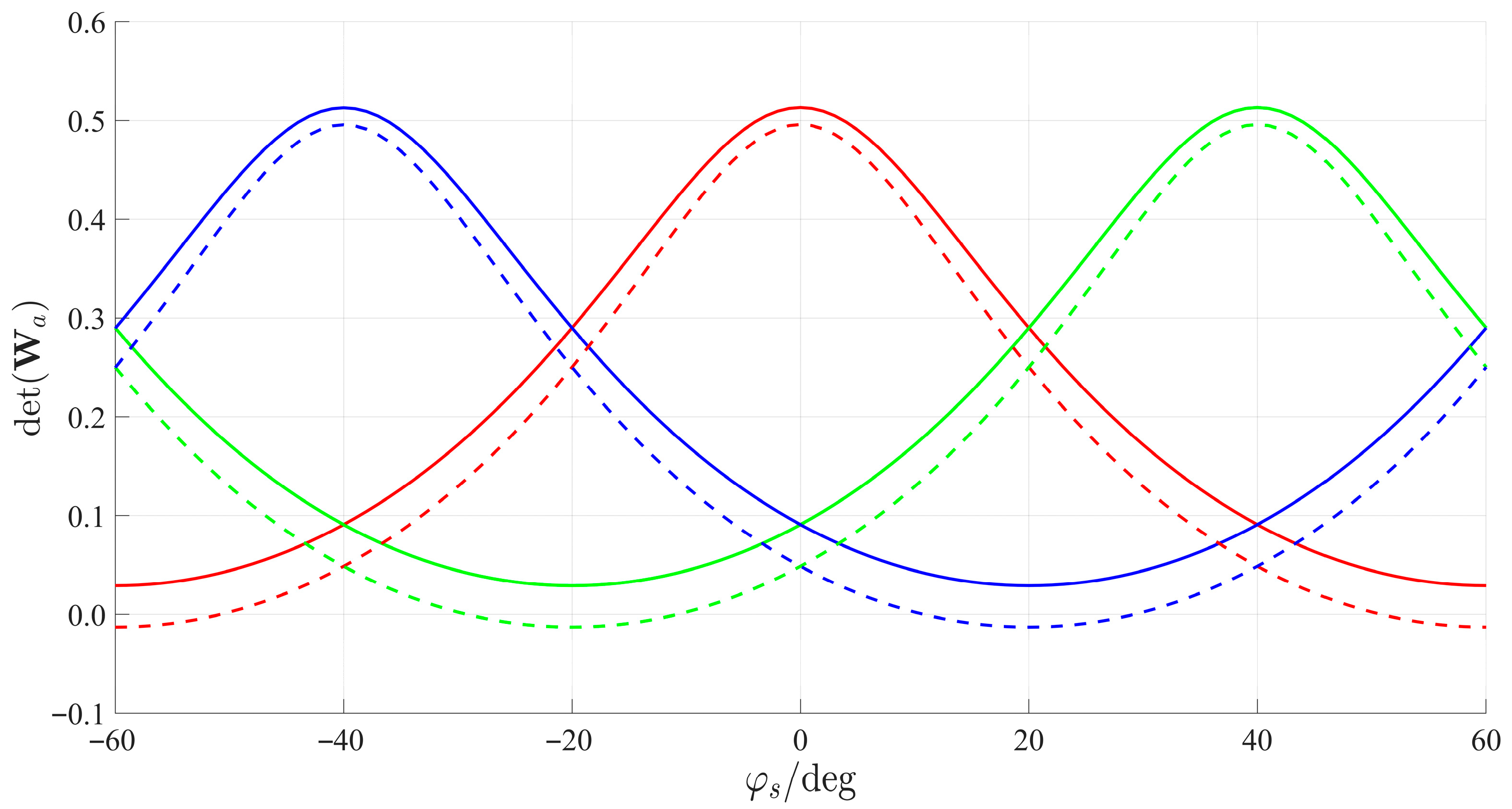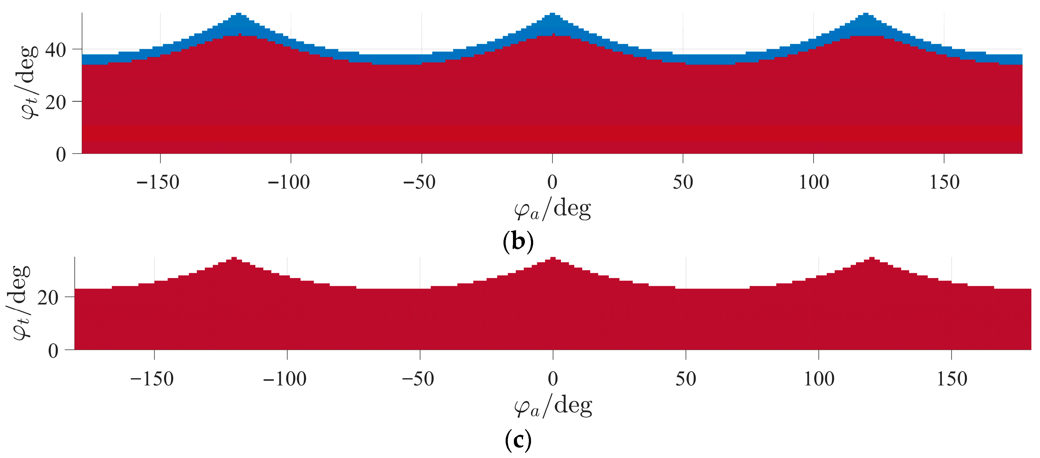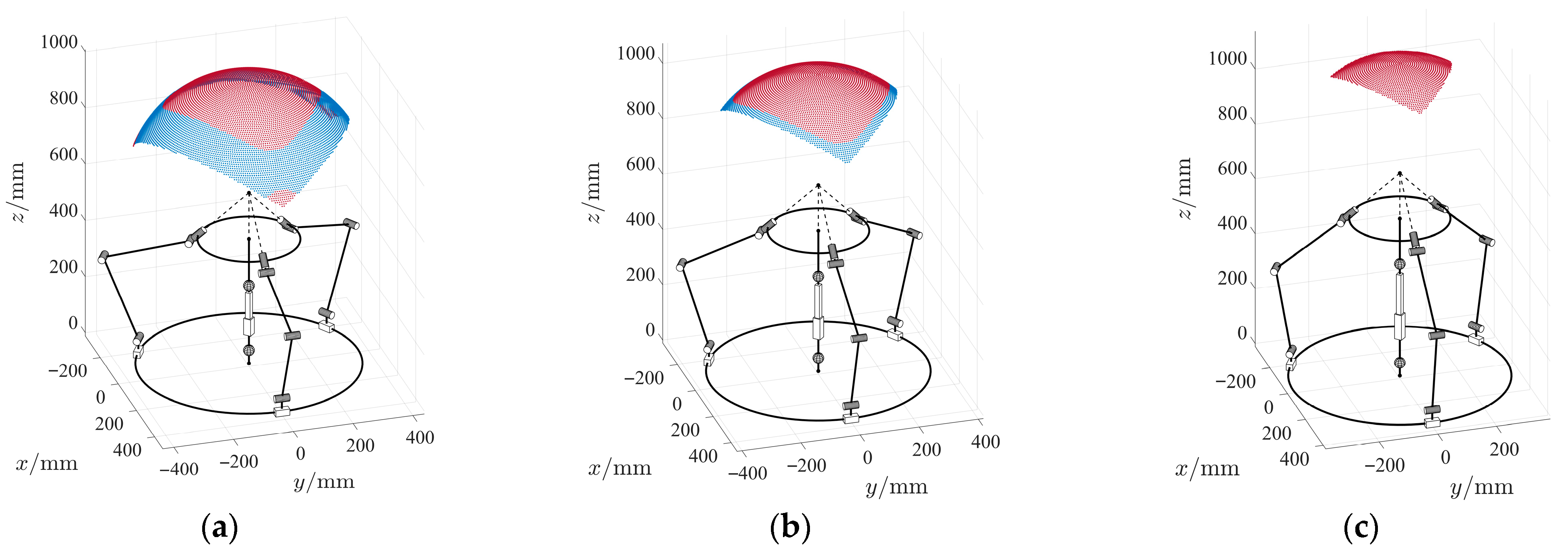 We observe that when mm or mm, the size and shape of the central region, where , remain unchanged. However, at mm, the workspace size is actually smaller than this region (the maximum tilt angle ranges from 33° to 45°, depending on the tilt axis orientation). Therefore, we conclude that the loci of parallel singularities do not depend on . This result is expected since the coordinates of the actuation wrenches depend only on the orientation of the moving platform and its geometry.