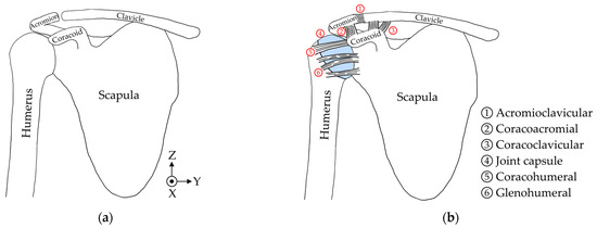 Illustrations of the human shoulder complex: (a) with only bones; (b) with bones, ligaments, and articular cartilage (joint capsule) marked in blue.