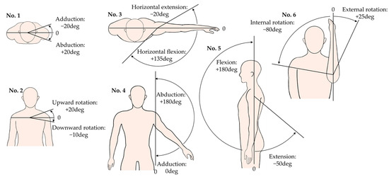 Reference value of ROM for six basic motions of shoulder complex. No. 1 and No. 2 are motions of the scapula, and Nos. 3–6 are motions of the shoulder joint.