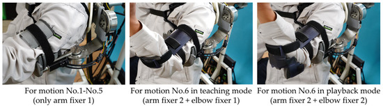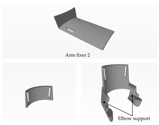 As mentioned in Figure 7, there are two options for the arm fixer. The one illustrated in Figure 7 is made of nylon and is used for motion Nos. 1–5, while the other one is used exclusively for motion No. 6 (external/internal rotation of the shoulder joint). It enhances torque transfer efficiency in comparison with its former version [12,13], in combination with a new part called the “elbow fixer”, thanks to a longer torque arm. For the elbow fixer, there are also two options for teaching mode and playback mode. These parts are all 3D-printed in resin, and their CAD is depicted in Figure 8.