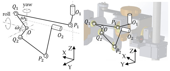 The geometric link model and its corresponding link mechanism shown in CAD are illustrated in Figure 10. Point O is defined as the origin. The scapula board, where the scapula plate is attached, can be rotated about the X-axis and Z-axis as the left half of Figure 10 shows, and these two axes intersect at O, a point on the scapula board that remains unmoved in space, just like O1 and O2. P1, P2, Q1, and Q2 all denote ball joints. Q1 and Q2 are fixed to the scapula board. The segment P1O1 is parallel to XO2Y plane and the segment P2O2 is in the YO2Z plane.