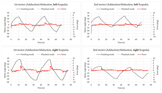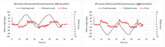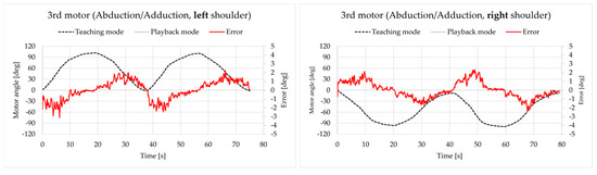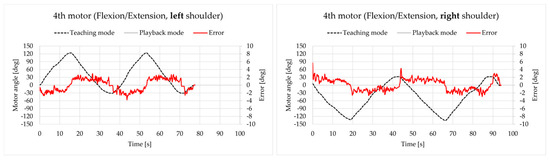 The angle of the 1st and 2nd motors in both teaching and playback mode are presented in Figure 11, along with the error value (playback–teaching). The angle data apply to the vertical axis on the left, and error data apply to the vertical axis on the right, which are the same for all the remaining figures in this section.