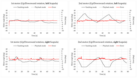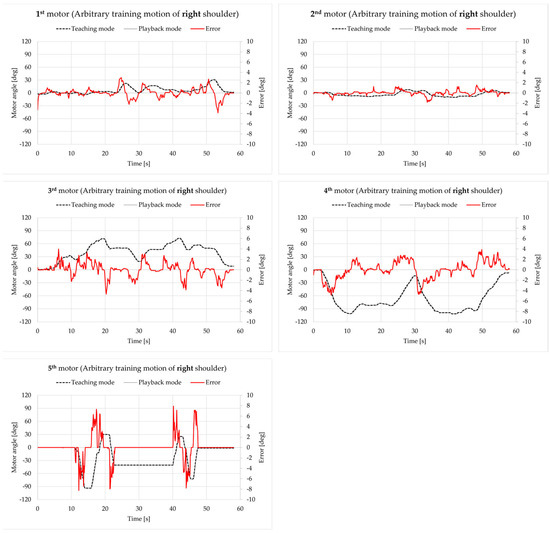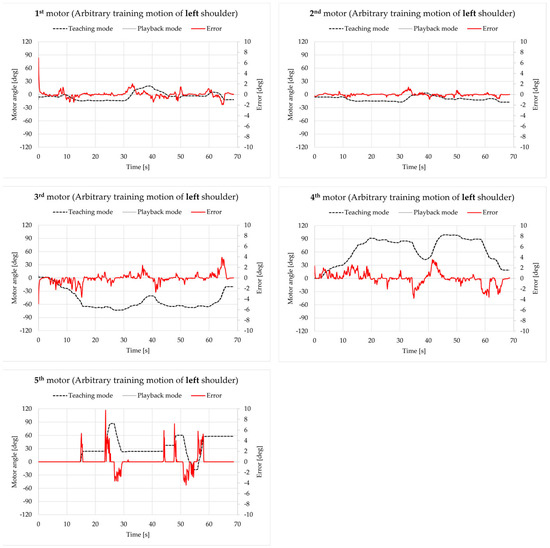 As a sum of all six basic motions described above, an arbitrary training motion was performed for both the left and right shoulders. The authors tried to have all five motors involved in this motion simulate the actual training motion. Figure 17 presents the results for the left shoulder.
