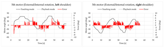 The results are presented in Figure 16. Although most errors were within the range of [−5 deg, 5 deg], some peak values went beyond this range, which are approaching −8 deg and 8 deg. It seems that the tracking performance of the 5th motor is not as good as the others, and this was especially the case when there was a higher acceleration. A representative instance was the behavior of the 5th motor for the left shoulder for the period of 25 s–40 s. The authors are also considering improving the performance of motion No. 6 by replacing the existing motor for a new one, along with other measures, in the future.