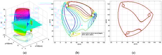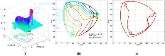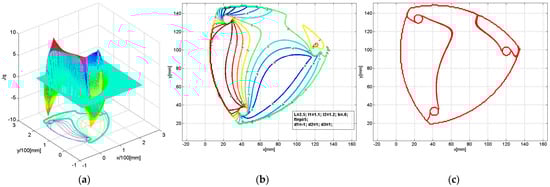 - In subfigures (c), only the singularity contours obtained by intersecting the surfaces with the 0-plane are shown.