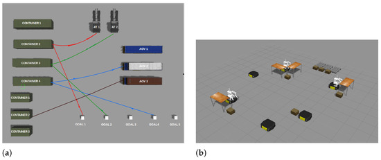 (a) A Simplistic view of task allocation in container terminal between automated trucks (ATs) and autonomous guided vehicles (AGVs) to pick up different capacity of containers created using Gazebo simulation environment. (b) Two different type of robots—Ridgeback wheeled mobile robots and Yumi manipulator mounted on Ridgeback wheeled mobile robot with different tasks based on their ability created using Gazebo simulation environment.
