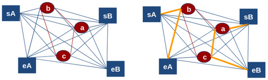 Illustration of multi-robot routing problem (MRR) with min–max objective. and represent initial positions of robots A and B, while and denote their corresponding end positions, respectively. Red lines represent utility costs between tasks (T) named a, b, and c, while blue lines indicate costs between robots (R) and tasks. Solution involves allocating tasks in sequential order to each robot such that maximum cost incurred by any one robot is minimized. In this case, and is optimal task allocation shown in orange lines.
