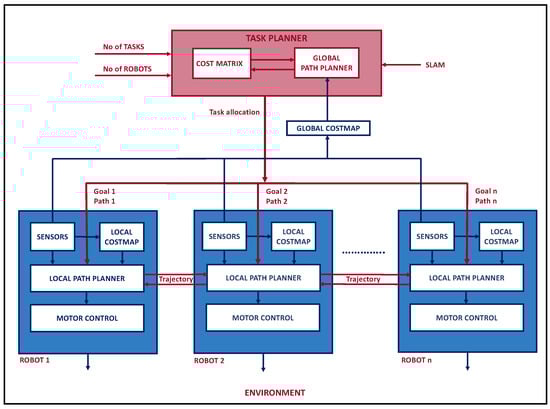 As illustrated in Figure 3, the task planner computes the optimal task allocation for all the robots. It requires the global map with Simultaneous Localization and Mapping (SLAM) data to obtain the localization poses of the M robots and N tasks. A simple 2D costmap is constructed using a 2D occupancy grid map along with map inflation, which is used as the input of the framework. It is assumed that the locations of the robots (or start points) and the tasks (intermediate via points) are all available as poses in the global coordinate system of the map. Any sampling-based planner that is complete or probabilistically complete can be used to calculate global paths. With the help of a A* global path planner, path lengths for all combinations of robot–task, task–task, and task–robot are calculated, producing individual global paths between any two consecutive points (robot–task, task–task, task–robot) as shown in the following video: https://youtu.be/clFyK9Sv7JI?si=7nH9Qa6ma1cYVJtp accessed on 25 January 2025. The task costs T are assumed to be one. These values are then used to create the utility cost matrix . Thus, the task planner will have real-time paths and their timing constraints in continuous space. The global path planner module can also be used for complete replanning if there are significant conflicts that the local trajectory planner cannot handle in a worst-case scenario. For the extended-SPADES framework, both and [48] are used as the path planners, depending on the environment. While is simple, efficient, and preferred in a static environment, supports dynamic replanning and path cost interpolation, resulting in lightweight repairing of plans and smooth paths during execution. Hence, it can be used in a dynamic environment to calculate global paths.