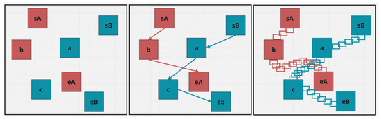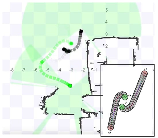 The optimal task allocation is computed using the deterministic annealing method for small- to medium-sized problems [53] and the heuristic search method for large-sized problems [12]. A detailed overview of these methods, the algorithms, and the results are discussed in detail in [49,54]. The following two outputs are obtained from the task allocation method: the optimal task allocation in the form of the solution matrix V (optimal task order sequence for each robot) and the corresponding global paths for each robot based on this solution. If we consider a scenario involving two robots, denoted as A and B, each tasked with completing three specific tasks labeled a, b, and c—as in the example in Figure 2—the ideal task allocation is as follows: robot A follows the sequence (robot A starts at position , performs task b, and subsequently moves to end position ), while robot B follows (second robot task allocation is robot B begins at position , executes task a followed by task c, and then proceeds to end position ). So, the corresponding global paths for each robot are then computed as follows: The global path for robot A is given by the sum of the path segments and , expressed as . For robot B, the global path is the sum of , , and expressed as .