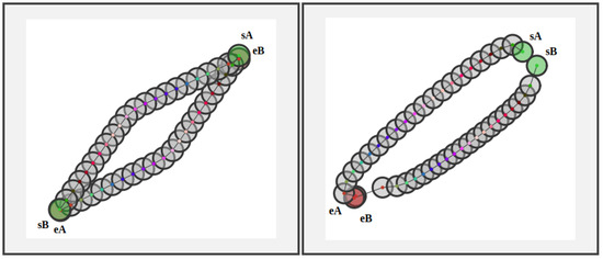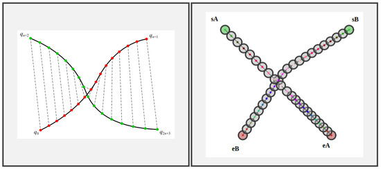 A simple graphical user interface developed by [55] to study CHOMP was extended to multi-robots with the interference objective (https://github.com/jenniferdavid/multi-CHOMP accessed on 15 January 2025) by [56]. It was implemented using C++11 with the Eigen library and the GTK (GIMP ToolKit) library to demonstrate the interference objective in a simple way. For example, in Figure 5, the interference of two intersecting trajectories is explained where the closer points mean the velocity is slower and the further apart points imply faster velocity. Figure 6 explains two different scenarios featuring trajectory interference. In the first one, the starting point of robot is the end point of robot and vice versa. Hence, the robots start to move towards each other at the same time and as they get closer, especially at the mid-point of the trajectory, they tend to move further away to avoid collision. In the second scenario, the two robot starting points are next to each other but both robots have the same end point. So, the robots move together at the same speed and adapt the trajectory such that the distance between them is large and when they reach the end point, the robot A is prioritized over robot B.