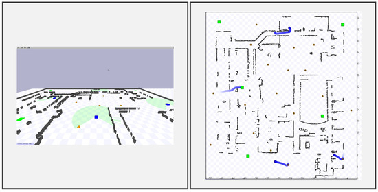 2D perspective view (left) and top view (right) of the Stage simulator world of a Willow–Garage map. There are 7 robots (blue), 18 tasks (orange), and 7 drop-offs (green). The robots’ sonar can be seen via the light green color in the left picture. The path trails of each of the robots can be seen in the fading blue color.