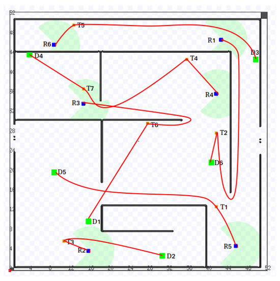 To begin with, the initial positions of the robots, tasks, and goals are used to calculate the initial cost matrix in the given occupancy grip map. In our case, the cost matrix is the path length between the tasks, goals, and robots calculated using the global path planner A* algorithm, as shown in the video in Section 3.3.1. The computation time varies with the size of the problem. For example, with five robots and 18 tasks, it takes up to 52 s. This cost matrix is then used by the task planner to calculate the optimal task allocation at that given instant. However, this is for the first set of task allocation tasks; the subsequent task allocation can exploit this knowledge, which can give faster solutions. After the cost matrix is computed, the optimal task allocation for five robots and 18 tasks is calculated in 0.02 s using the heuristic method. It should be noted that this is the complete and unique optimal task allocation solution for this problem set under the static conditions. Our task allocation method uses either the heuristic method or the deterministic annealing method. The tasks are then allocated to each of the robots in an ordered way. The task planner also publishes the corresponding paths to each of the robots. The robots then start executing the tasks by moving using the move base ROS package as shown in Figure 8. In the next step, as the robots move, each of the local motion planner multi−CHOMP interact with each other to avoid path conflicts (https://youtu.be/gXSRuJjHJDM accessed on 15 January 2025. multi−CHOMP reparametrizes the time factor in the conflicting trajectories without losing their initial optimal paths. This can be seen in Figure 9 where the two set of robots avoid each other efficiently.