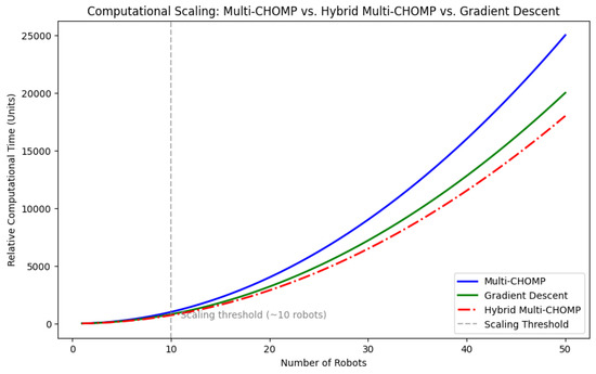 Computational scaling of multi−CHOMP vs. gradient descent vs. hybrid multi−CHOMP. A scaling threshold (10 robots) is highlighted, beyond which the gap between the three methods becomes more pronounced.