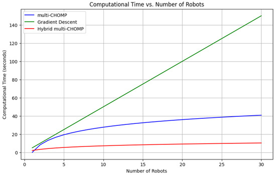 Computational Time—When it comes to computational time, as shown in Figure 11, the multi−CHOMP algorithm does not grow linearly compared to the gradient descent method and performs poorly. Table 1 gives the complexity analysis of these three methods.