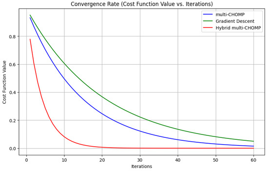 Convergence rate of multi−CHOMP and its hybrid method vs. gradient descent in terms of iterations.